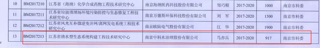 2017年11月,江蘇省科學(xué)技術(shù)廳將“江蘇省工程技術(shù)研究中心”建設(shè)項目下達(dá)給222家單位,南京中科水治理股份有限公司承擔(dān)“江蘇省清水型生態(tài)系統(tǒng)構(gòu)建工程技術(shù)研究中心”建設(shè)工作。