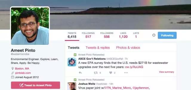 如果你的研究方向和他相似,盡可以跟他聯系,他的推特賬號是@watermicrobe,email是 a.pinto@neu.edu