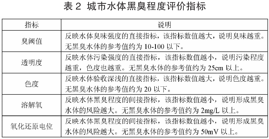 不同指標對水體黑臭程度的指示作用及檢測方法如下表所示: