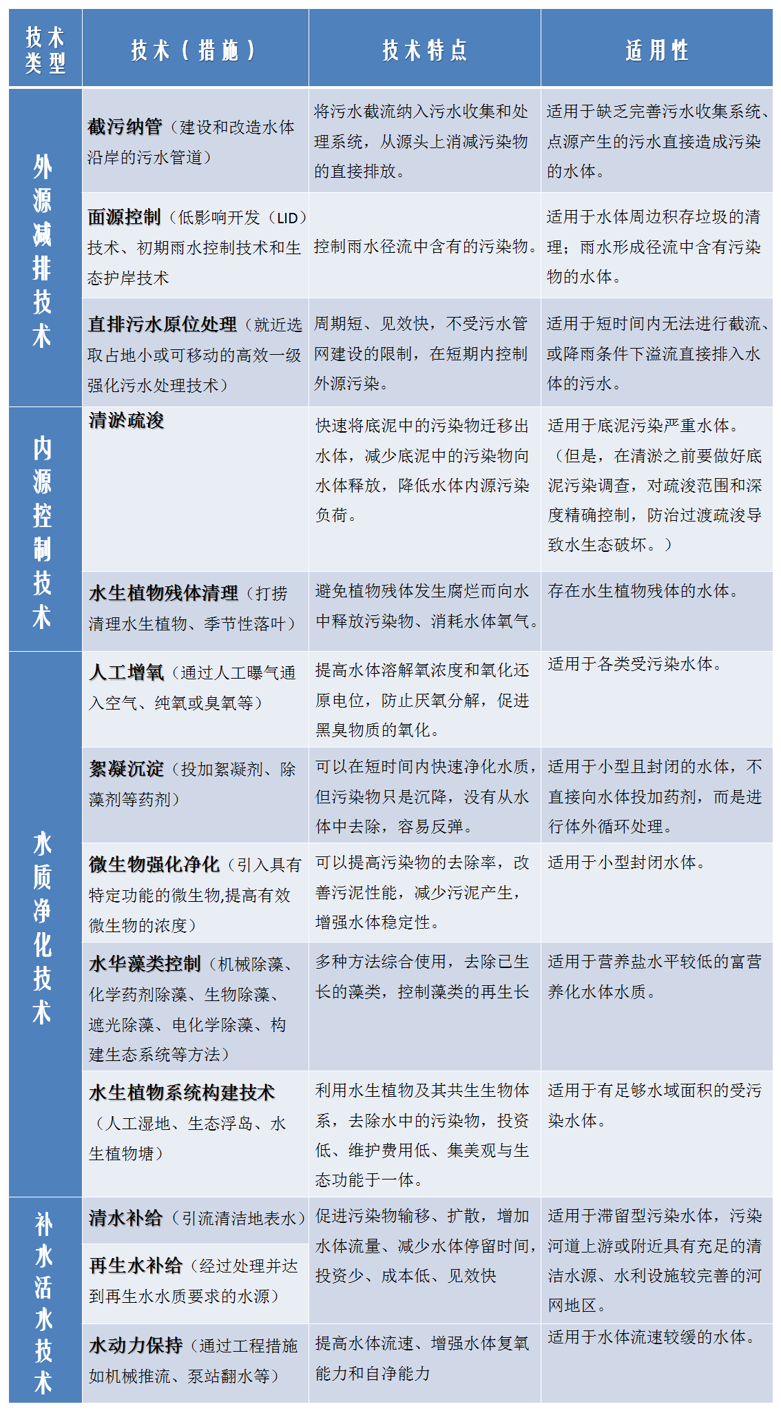 不同的治理技術具有不同的特點和使用范圍,沒有“萬能型”的技術,需要根據水體污染的程度、污染的原因和治理階段的不同,優先選擇適用技術,而不是所謂的“新”技術。現在,就讓我們來看一看怎么對癥下藥吧!